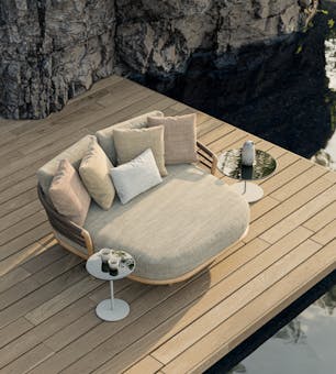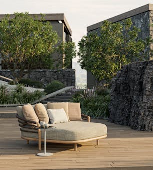Designed as a modular system, Archy Lounge offers multiple configurations, including a generous matching daybed that extends the collection’s relaxed, architectural comfort. A coordinated range of Archy Lounge low lounge tables completes the setting, available fully in teak or paired with tops in glass, lava or ceramic for added material contrast.
